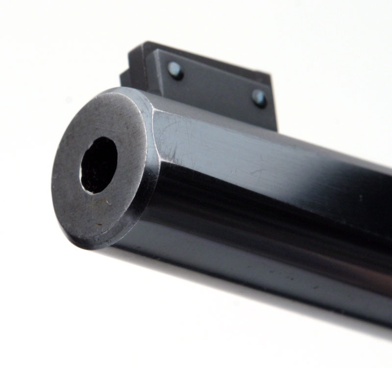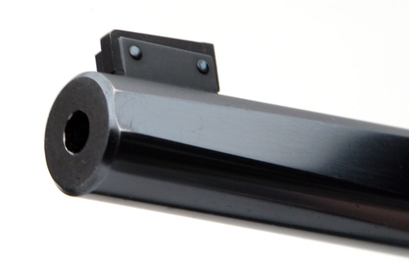 Colt Woodsman Match Target barrel muzzle and front sight. Note how the sight screws are fire blued.