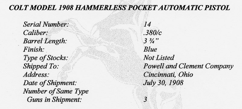 Colt Model 1908 Pocket Hammerless .380 ACP serial number 14 - This example has the earliest style roll markings on the left side of the slide. "PAT." is later changes to "PT." and "CONN." is later changed to "CT." Pistol was shipped with a blued finish with fire blued small parts and Type I black hard rubber grips. This is a consecutive to the August 2011 Gun of the Month, Colt Model 1908 Pocket Hammerless Serial Number 15. Serial number 14 was shipped in a three gun shipment to Powell and Clement Company, Cincinnati, Ohio on July 30, 1908.