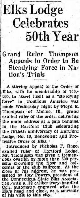 Documented Presentation and Configuration of Colt 1903 Pocket Hammerless .32 ACP serial number 515358 - Article from the Hartford Courant (Hartford, Connecticut), Thursday, February 23, 1933 p.12 documenting and describing the configuration and presentation of the Colt .32 automatic pistol by Roy Powers, president of the Connecticut State Elks Association to Floyd E. Thompson, grand exalted ruler of the order. The occasion was to celebrate the fiftieth anniversary of Hartford Lodge, No. 19, Benevolent and Protective Order of Elks. The Hartford Elks were founded in 1883 and this building, designed by John J. Dwyer, was built the same year as the nearby Hartford Club. It is a fine example of the Renaissance Revival style, while the Hartford Club is Georgian Revival. The Elks Lodge has a brownstone foundation, glazed buff brick walls, and a limestone trim that form a series of receding planes in the front elevation. Bands of raised brick at the first floor, recessed arch openings at the second floor, and the projecting roof-line cornice under the parapet contribute to the rich texture of the design. The tall stained-glass windows of the second floor mark the location of the ceremonial lodge hall. On the interior, the dark mahogany paneled first floor contrasts sharply with the brilliantly decorated and gilded lodge room above.