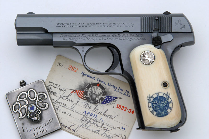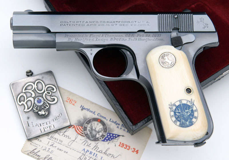 Presented to Floyd E. Thompson, GER, Feb. 22, 1933 Placement of the inscription is located where the serial number for this model is typically stamped. The inscription was so long that the factory relocated the serial number to right side of the frame, above the trigger area. This pistol was shipped to Hartford, CT Lodge of Elks Number 19 on February 22, 1933 (the day of presentation.)