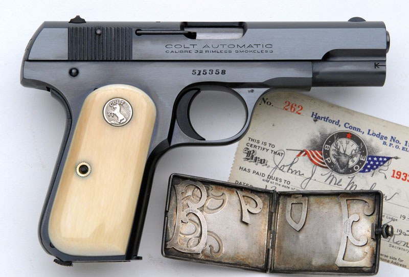 Colt Model 1903 Pocket Hammerless .32 ACP serial number 515358 - Right side showing relocated serial number. Pictured with this pistol is a period BPO Elks sterling silver stamp case with BPOE letters inside the case used to retain the stamps. Also pictured is a period BPOE Hartford, Connecticut Lodge No. 19 Membership Card from 1933-1934 for John J. McMahon, who was also a Colt employee.
