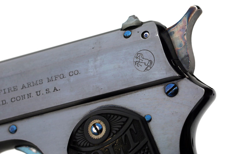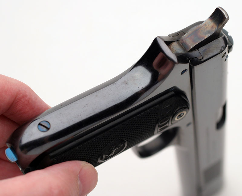 Colt Model 1900 Serial Number 4238 - grip straps retain most of the original blue. Note the high polish fire blue on the main spring screw and the magazine release as well as the color case hardening on the hammer.