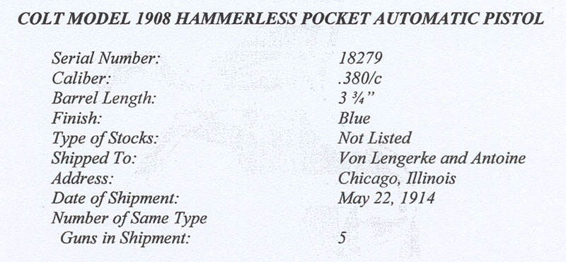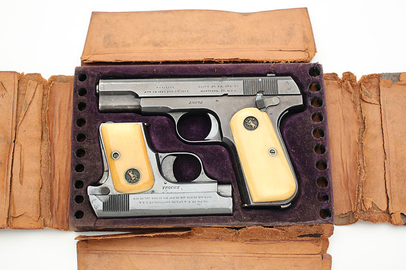 A very interesting and unusual cased set of two Colt Pocket Hammerless Pistols, one Colt 1908 Pocket Hammerless .380 ACP sn 18279 fitted with recessed medallion ivory stocks and Colt 1908 Vest Pocket .25 ACP serial number 123591 also fitted with recessed medallion ivory stocks. The 1908 Pocket Hammerless .380 ACP was shipped to Von Lengerke & Antoine in Chicago, Illinois on May 22, 1914 in a five gun shipment.