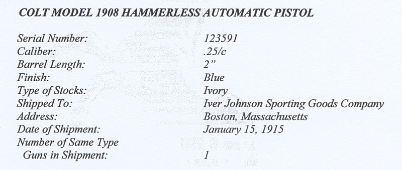 1908 Vest Pocket .25 was was shipped with blued finish and ivory stocks to Iver Johnson Sporting Goods Company in Boston, Massachusetts on January 15, 1915 in a one gun shipment.