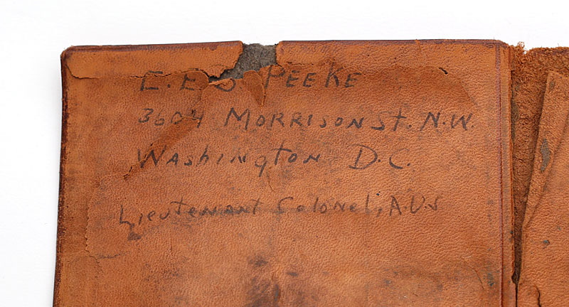 Inside the other flap is written "C.E.B. Peeke, 3604 Morrison St. N.W., Washington, D.C., Lieutenant Colonel, A.U.S." Also written on the bottom of the case is "Carroll E.B. Peeke, O-204846, Lieutenant Colonel, A.U.S." Col. C. E. B. Peeke (b. Seattle, 1898) is the