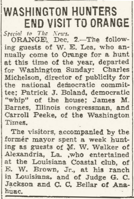 WASHINGTON HUNTERS END VISIT TO ORANGE, Special to the Port Arthur News, ORANGE, Dec 2, 1940. -- The following guests of W.E. Lea, who annually come to Orange for a hunt at this time of the year, departed for Washington Sunday: Charles Michelson, director of publicity for the national democratic committee; Patrick J. Boland, democratic "whip" of the house; James M. Barnes, Illinois congressman, and Carroll Peeke, of the Washington Times. The visitors accompanied by the former mayor spent a week hunting as guests of M.W. Walker of Alexandria, La., who entertained at the Louisiana Coastal club, of E.W. Brown, Jr., at his ranch in Louisiana, and of Judge G.C. Jackson and C.C. Bellar of Anahuac.