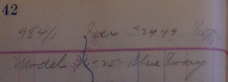 Colt Special Order Record - Factory order number 984/1 indicating shipment to "Iver" for Iver Johnson #2449 1/15/15, Model N-25-Blue Ivory.