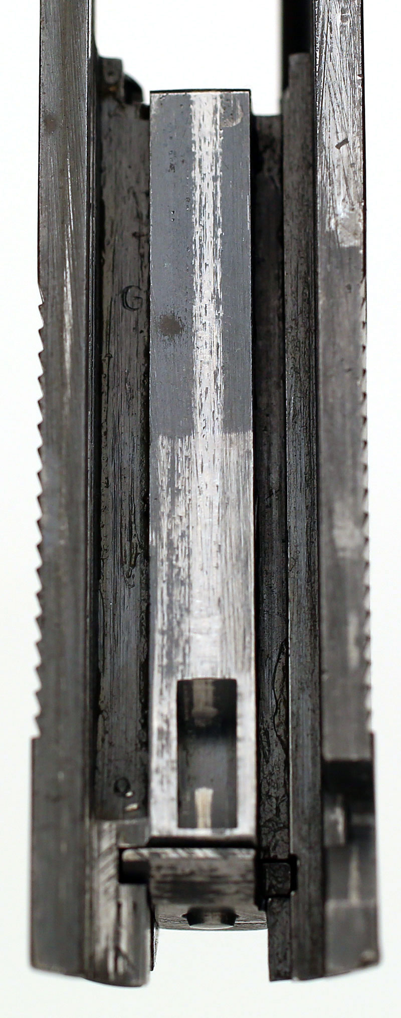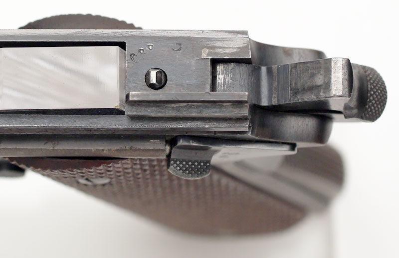Colt Model 1911A1 .45 ACP serial number 722980 (ca. 1941) - Rear view of hammer, slide, frame and grip safety. ![]() Colt Model 1911A1 .45 ACP serial number 722980 (ca. 1941) - Slide has matching number under the firing pin stop and has G stamped inside next to the firing pin.