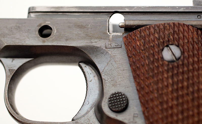 Colt Model 1911A1 .45 ACP serial number 722980 (ca. 1941) - Close-up of RS inspector's mark below slide stop hole. There is a P proof on the top of the slide, in front of the rear sight and alto a P on the left side of the frame near the magazine release button.