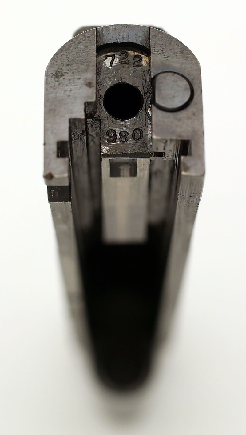 Colt Model 1911A1 .45 ACP serial number 722980 (ca. 1941) -rear of slide showing matching serial number located under firing pin stop.