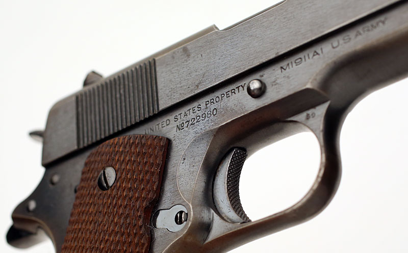 Colt Model 1911A1 .45 ACP serial number 722980 (ca. 1941) - Milled checkered trigger.
