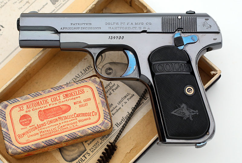 Colt 1903 Pocket Hammerless .32 ACP sn 139700 - High condition Type III manufactured ca. 1912. This pistol has British proof marks (letter pending). Original high polish blued finish with fire blue small parts (trigger, thumb safety, grip screw, magazine release, extractor) and full blued barrel.