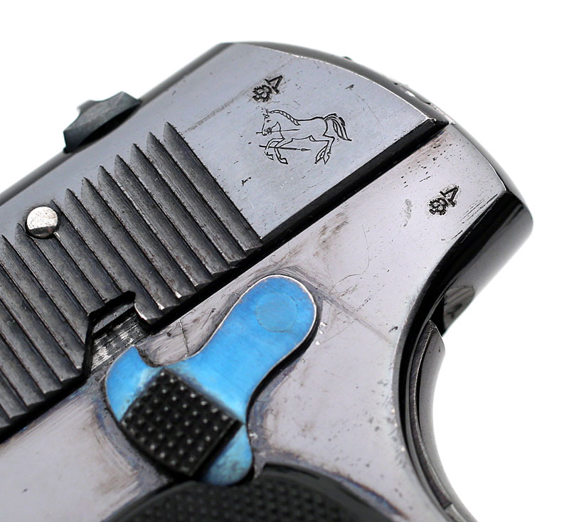 Colt 1903 Pocket Hammerless .32 ACP sn 139700 - Left side, close-up of British proof marks stamped on the the slide and frame. Note the fire blued thumb safety.