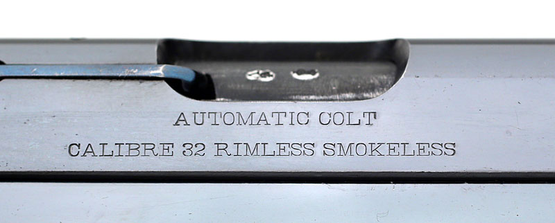 Colt 1903 Pocket Hammerless .32 ACP sn 139700 - Right side, close-up of slide markings "AUTOMATIC COLT" over "CALIBRE 32 RIMLESS SMOKELESS".