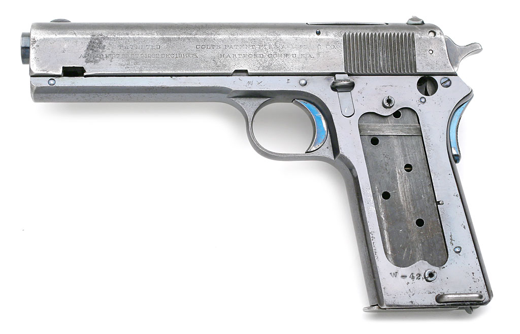 Colt Model 1907 Military Number W-42 .45 ACP - Interesting Model 1907 pistol with no serial number in the standard location. This pistol has all the original unaltered 1907 pistol design features that existed prior to the Army's request for changes to the hammer, grip safety and ejector port. During the testing of the pistols, the Army asked Colt's to make some modifications to the pistols; they asked for the ejection ports to be enlarged, the grip safety to be replaced with a later style grip safety and the hammer spur to be made thinner.  There was an additional refinement of the sear as the sears were breaking during testing.