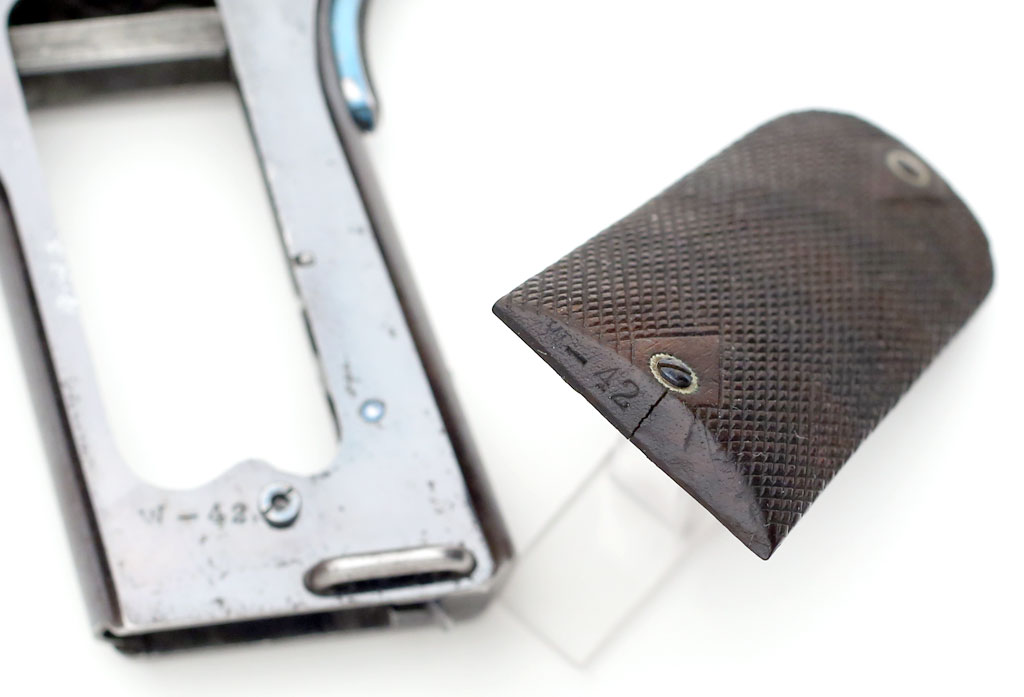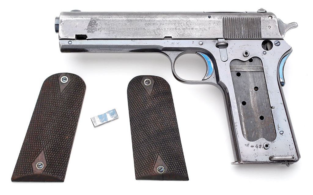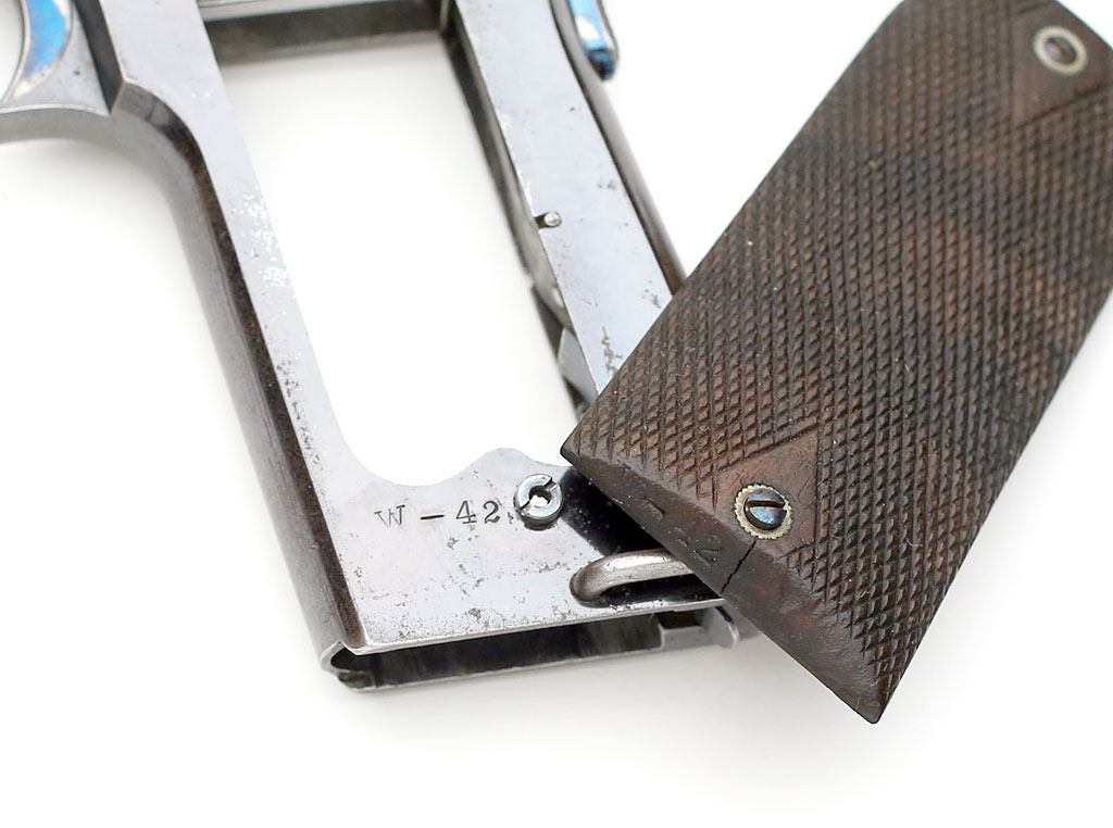 Colt 1907 .45 ACP - with stocks removed to show "W-42" mark stamped on the lower left side of the frame.
