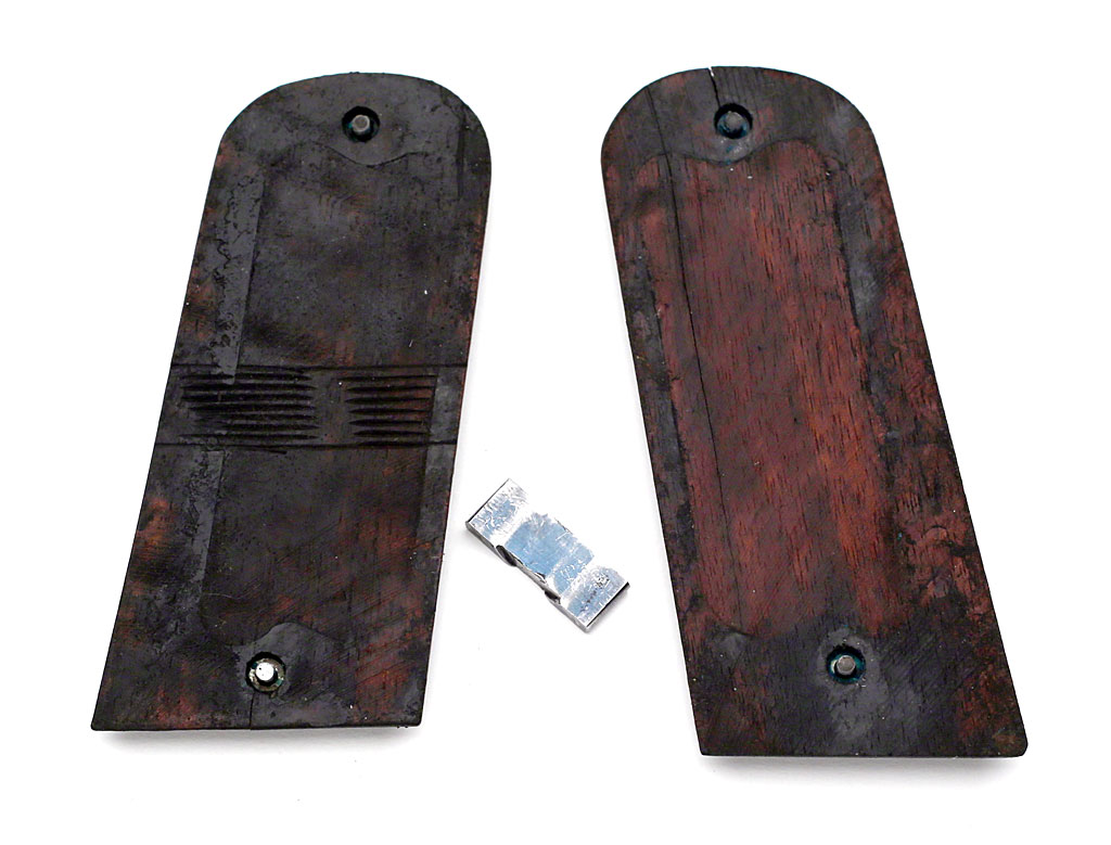 Colt 1907 .45 ACP - rear of stocks showing unusual horizontal lines cut into the back of the left stock.