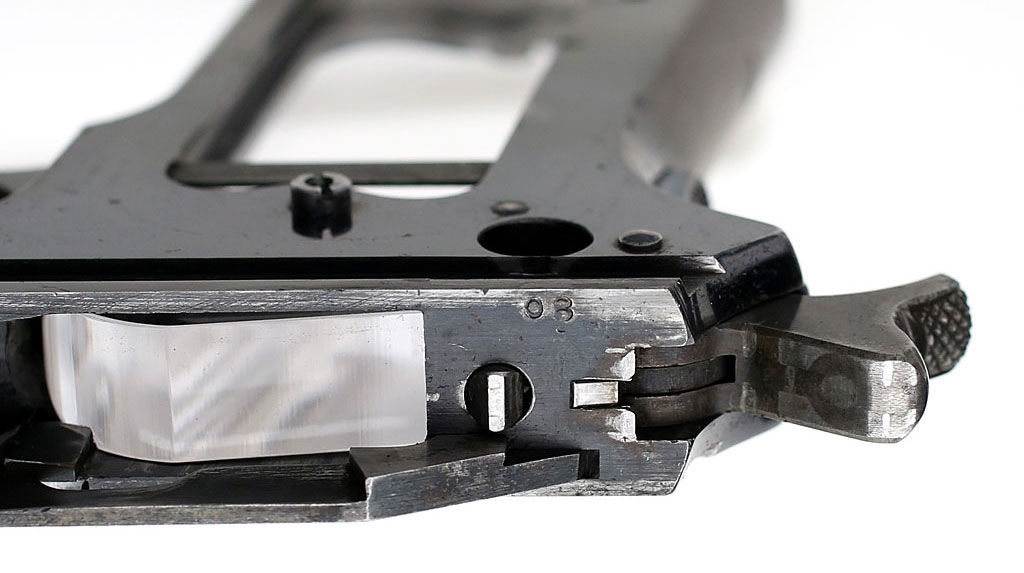 Colt 1907 .45 ACP - The frame and slide are both internally marked "08" or "80" depending on how you read it. Mark on the top of frame near disconnector. (Note: frame is on a Plexiglas stand that extends into the magazine well.)