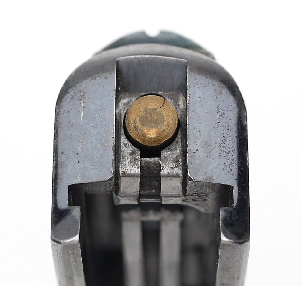 Colt 1907 .45 ACP Auto Loaded Cartridge Indicator -Small plunger at the 1:00 position to the firing pin in the above photo activates the loaded cartridge indicator on the top of the slide.