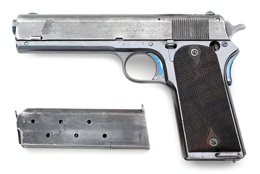 Most Model 1907 trials pistols (Serial numbers 1 -200) were returned to Colt's and received a modified grip safety, hammer with smaller hammer spur and nearly vertical ejection port. Auto Indicator to show that chamber is loaded, Auto safety, Strengthened stirrup, and Lengthened trigger stirrup pin.
