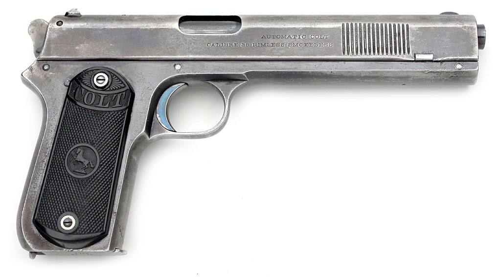 Very Early Colt Model 1902 Sporting Model - This gun has the early milled front slide serrations and Browning's Patent marking on the left side of the slide along with the April 20, 1897 patent date. The 1902 patent date was not added until approximately serial number 5,000. During this period of production, guns with odd numbered serial numbers were fitted with rounded hammers and guns with even numbered serial numbers were fitted with spur hammers. These guns lacked the slide lock and lanyard loop as seen on the 1902 Military Model. This Colt 1902 Sporting Model was in the first batch of 10 guns shipped to Browning Brothers, Ogden, Utah on July 11, 1902 and is the earliest serial number in this shipment. Guns in this shipment were 4367, 4369, 4371, 4373, 4375, 4377, 4379, 4381, 4383 and 4385.