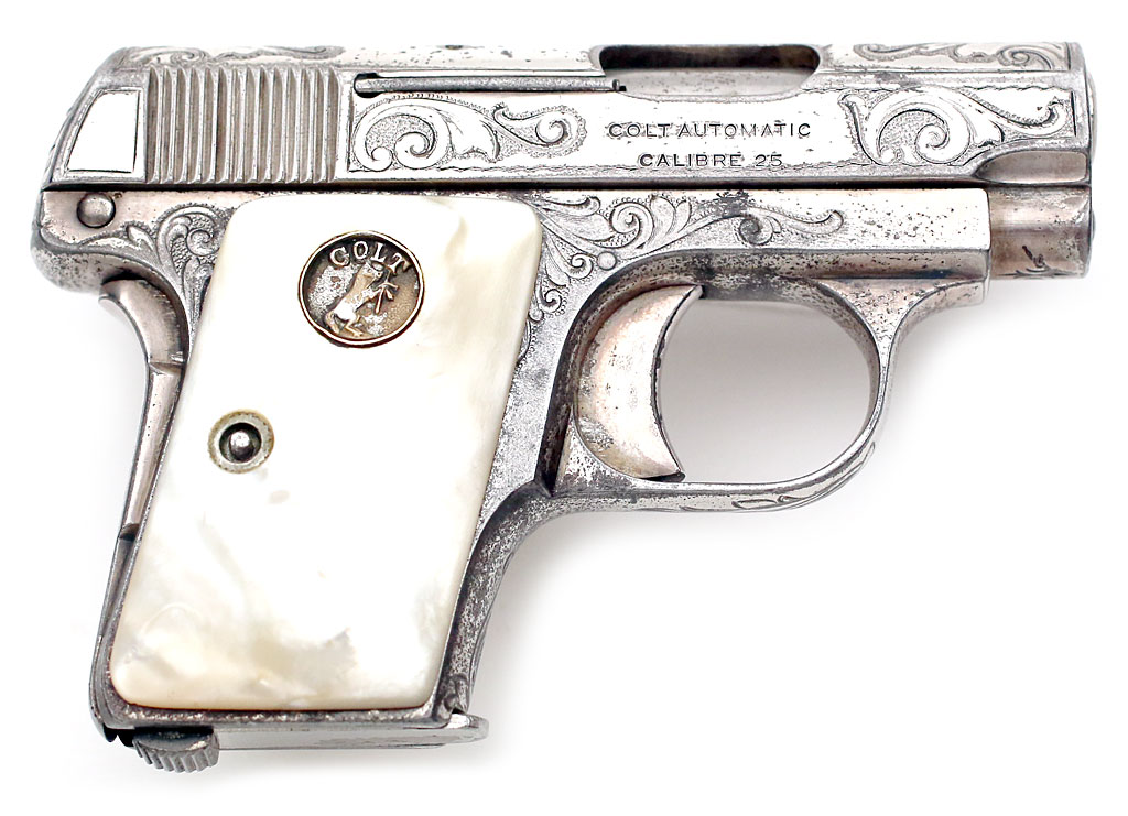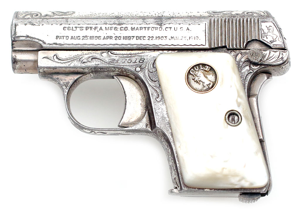 Colt 1908 Vest Pocket .25 ACP serial number 217518 - Pistol is factory engraved (Level 3) with silver plated finish and recessed medallion square top mother of pearl grips. One of a pair shipped to Krakauer, Zork & Moye Company in El Paso, Texas. The second gun in the shipment was featured as the Coltautos.com Gun of the Month in August 2012.