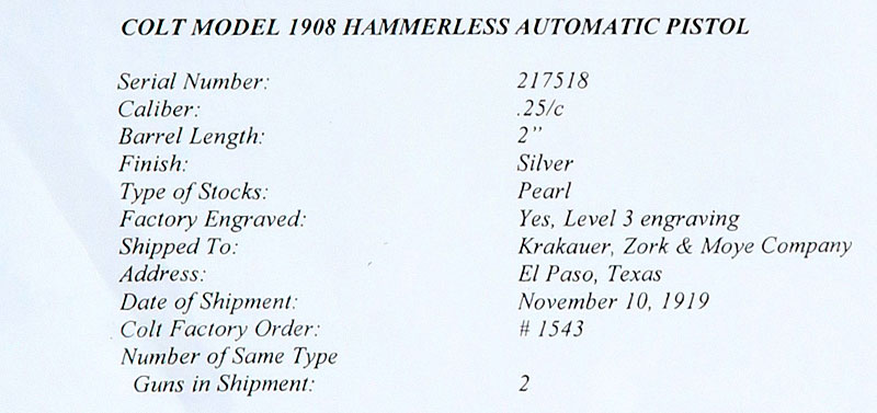 Colt 1908 Vest Pocket .25 ACP serial number 217518 Factory Letter - Pistol is silver plated, with mother of pearl stocks with level 3 factory engraving and was one of two shipped on November 10, 1919 to Krakauer, Zork & Moye Company, El Paso, Texas. Work was processed on Colt Factory Order Number 1543.