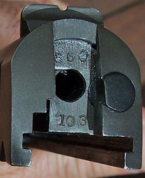 Colt Model 1911A1 .45 ACP Serial Number 860103 - ordnance wheel located behind the right grip. Visible are the rough machining marks which removed the "GOVERNMENT MODEL" and commercial serial number prior to renumbering the gun in the military serial number range.