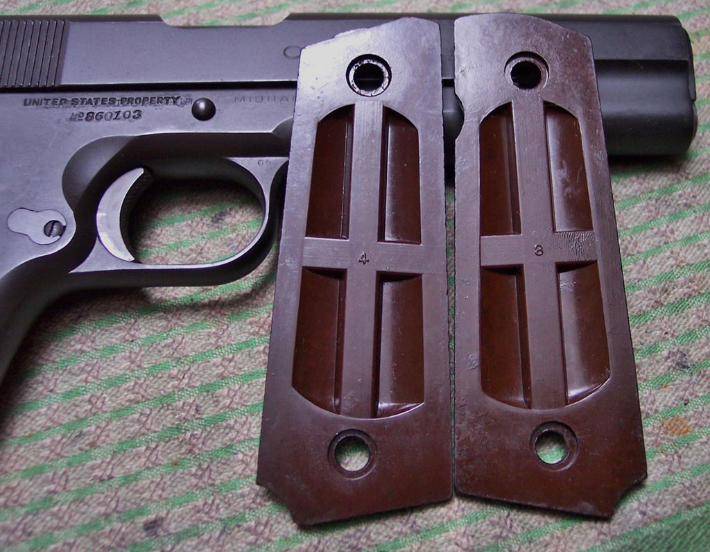 Gun has Type 2 Coltwood plastic grips with strengthening ribs, mold numbers and large reinforcing rings around screw holes.