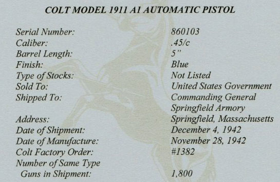 Colt Model 1911A1 .45 ACP Serial Number 860103 -Factory letter documents this pistol as being sold to the United States Government, shipped to Commanding General, Springfield Armory, Springfield Massachusetts on December 4, 1942. It was one of 1,800 guns in shipment and was processed on Colt Factory Order number 1382.