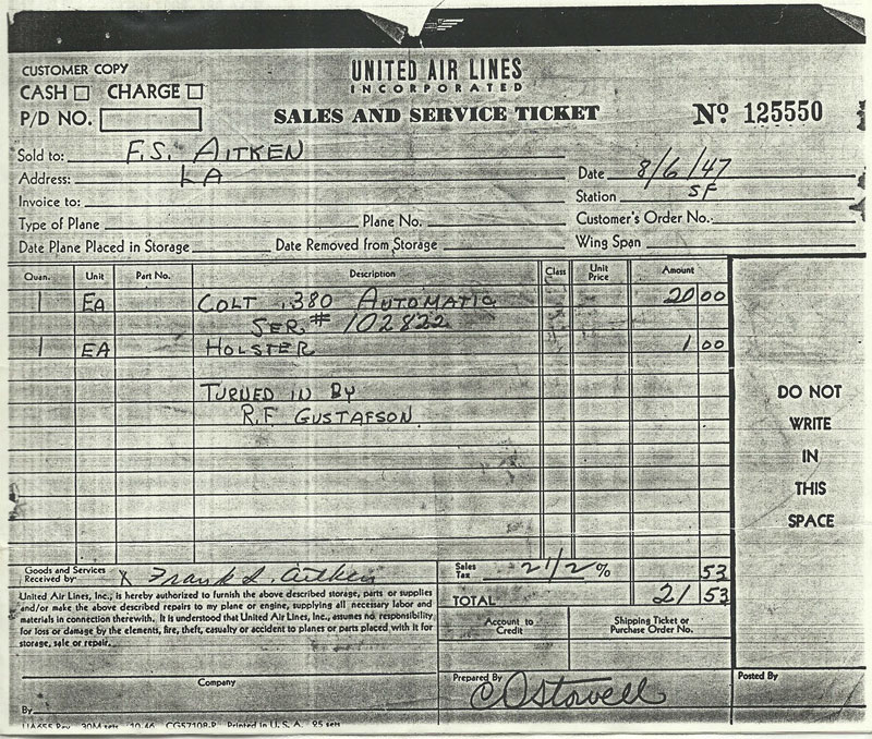 Colt 1908 Pocket Hammerless .380 ACP sn 102822 - service ticket showing the pistol was turned in by R.F. Gustafson and purchased by F.S. Aitken on August 6, 1947. |
