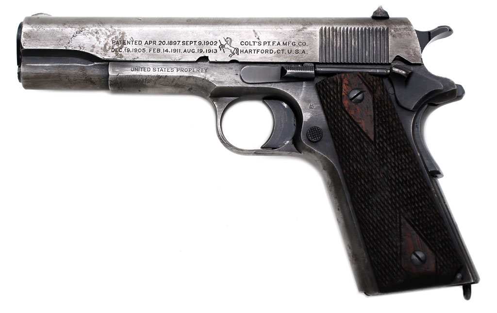Colt Model of 1911 U.S. Army serial number 508646 - pictured with accompanying holster and canvas magazine pouch. Sold to the United States Government, Bush Terminal, Brooklyn, New York, November 5, 1918 in a shipment of 10,050 guns.