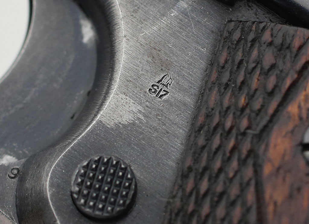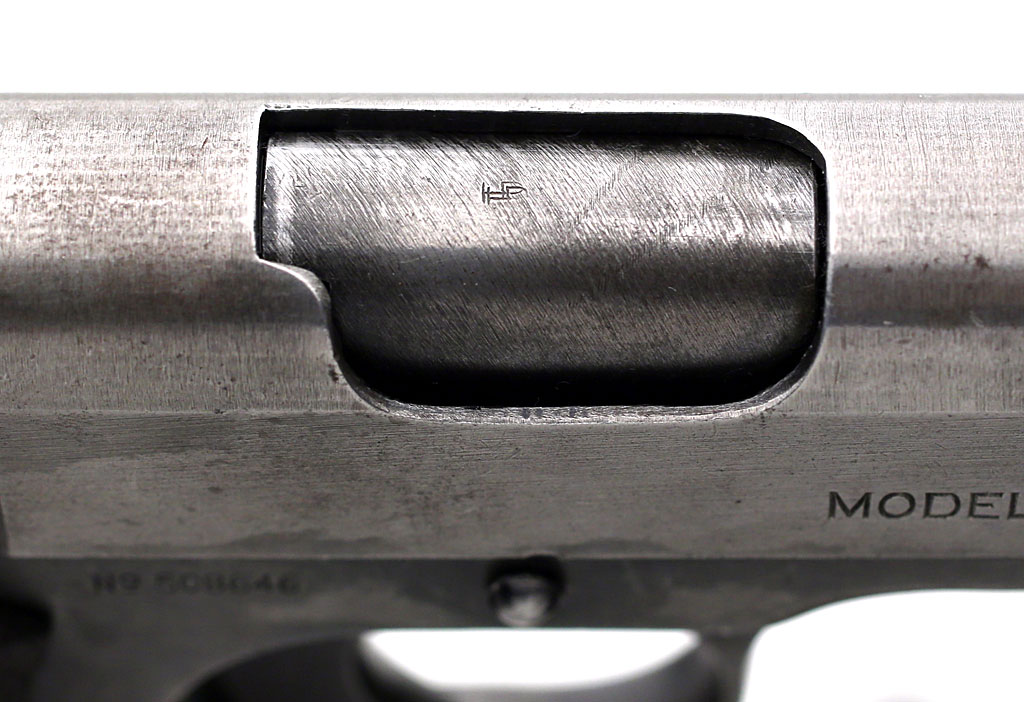 Colt Model of 1911 U.S. Army - "HP" proof mark on barrel chamber visible through ejection port. This example is double-struck.