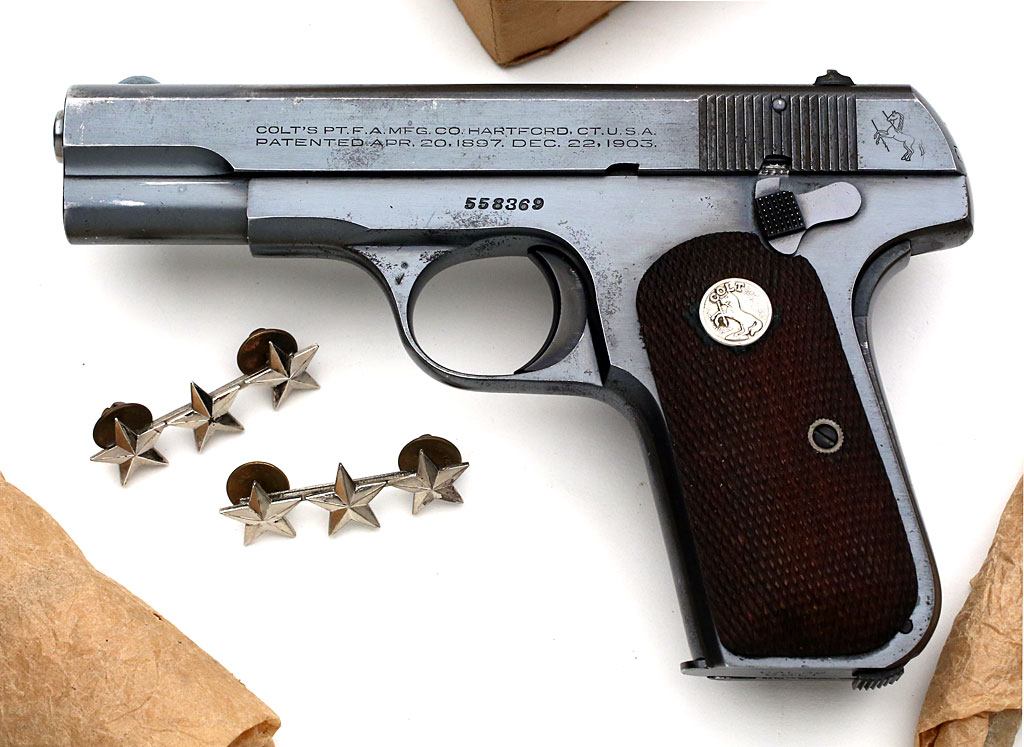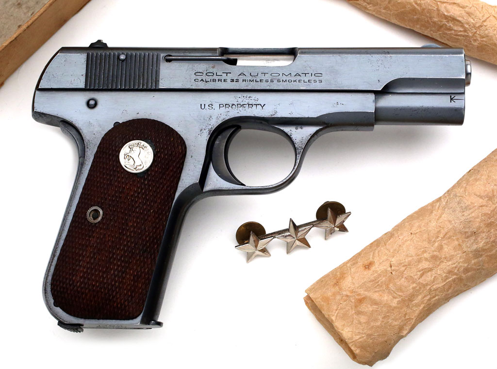 Colt Model 1903 Pocket Hammerless .32 ACP serial number 558369 - U.S. Property marked pistol with original blue finish, issued to LTG Robert Milchrist Cannon in 1954. Pistol has punch-dot ordnance mark on the left side of the trigger guard, just above the Colt Verified Proof mark "VP".