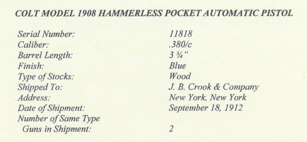 Colt Model 1908 Pocket Hammerless .380 ACP serial number 11818 - blue finish with factory "plain wood stocks". Pistol was one of two .380s shipped to J.B. Crook Co., New York on September 18, 1912 with smooth walnut stocks accompanying three 1903 .32 and three 1908 Vest Pocket .25 pistols all of which had these same stocks.