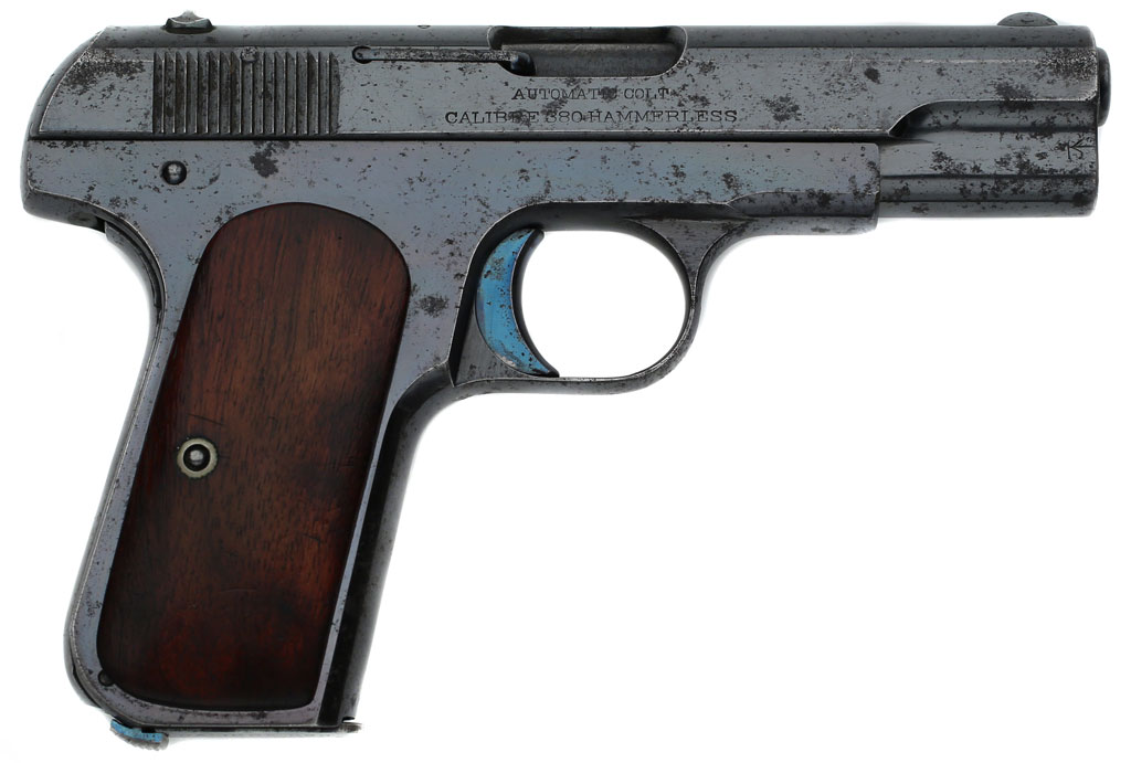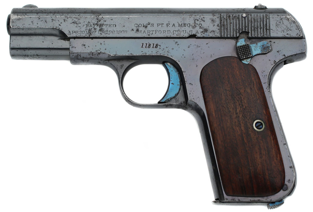 Colt Model 1908 Pocket Hammerless .380 ACP serial number 11818 -shipped from the factory with "plain wood stocks" right side view. |