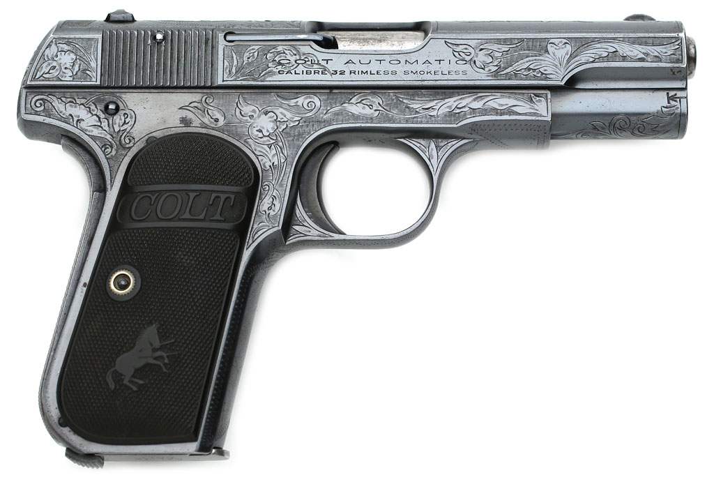 Colt Model 1903 Pocket Hammerless .32 ACP factory master engraved - serial number 382938, factory master engraved by William H. Gough, distinctive five pointed star engraved on rear of frame. This star appears on other known examples of Gough's work.