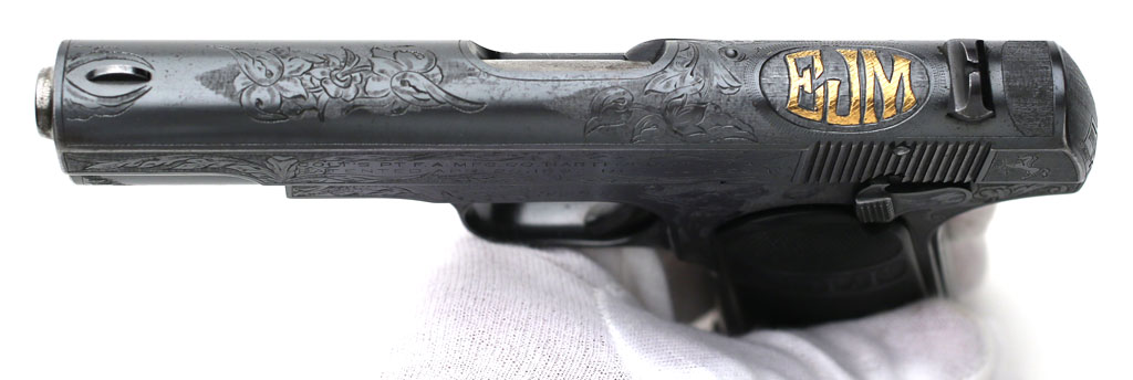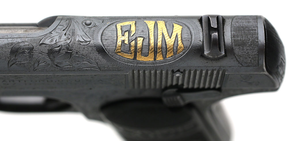 Colt Model 1903 Pocket Hammerless .32 ACP factory master engraved - serial number 382938, factory master engraved by William H. Gough, factory gold inlaid initials "EJM" most likely representing "E.M.J." as the larger middle initial typically signifies the last name.