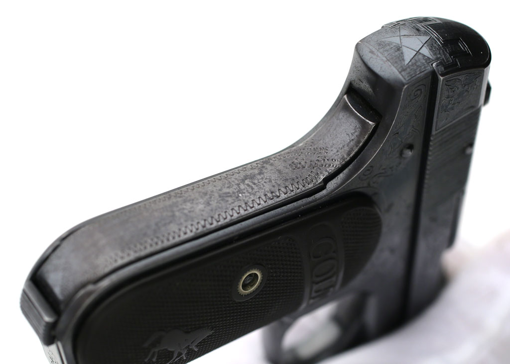 Colt Model 1903 Pocket Hammerless .32 ACP factory master engraved - serial number 382938, factory master engraved by William H. Gough. Close-up of grip safety.