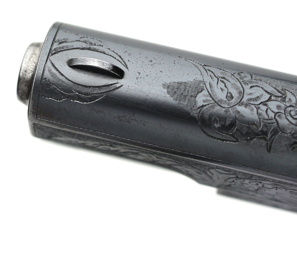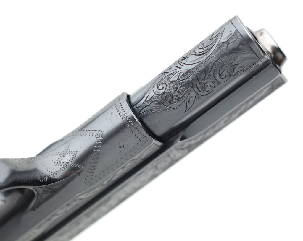 Colt Model 1903 Pocket Hammerless .32 ACP factory master engraved - serial number 382938, factory master engraved by William H. Gough. Close-up of forward top of slide and front sight.