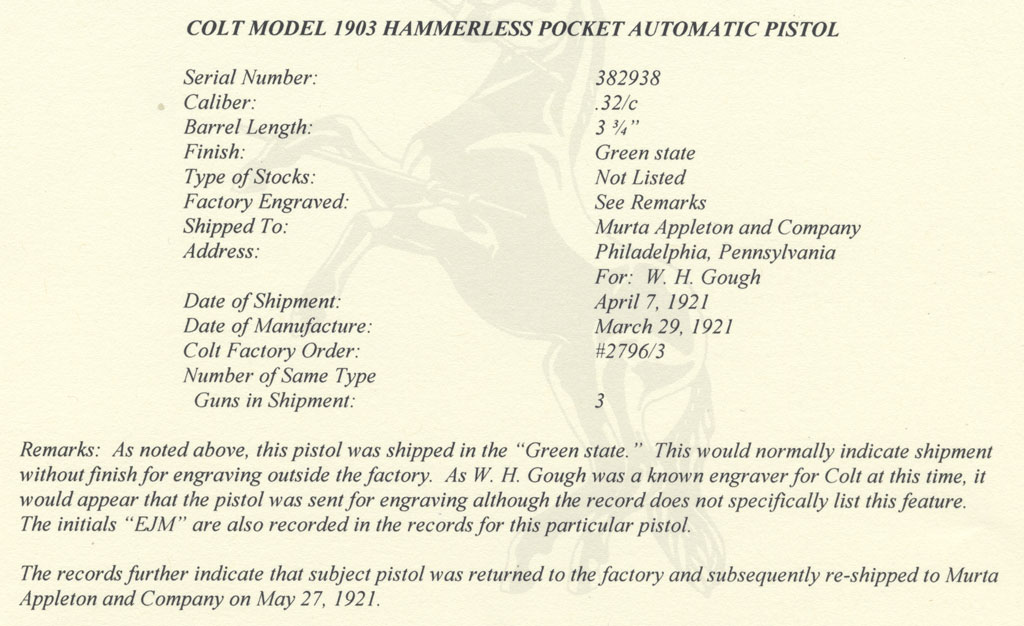 Colt Model 1903 Pocket Hammerless .32 ACP - factory letter indicates that Colt Model 1903 Pocket Hammerless .32 ACP pistol was shipped in the green state to Murta Appleton and Company, Philadelphia, Pennsylvania for W.H. Gough on April 7, 1921. The date of manufactured was March 29, 1921. It was processed on Colt Factory Order # 2796/3, Number of Same Type Guns in Shipment: 3. Remarks: As notes above, this pistol was shipped in the "Green state." This would normally indicate shipment without finish for engraving outside the factory. As W.H. Gough was a known engraver for Colt at this time, it would appear that the pistol was sent for engraving although the record does not specifically list this feature. The initials "EJM" are also recorded in the records for this particular pistol. The records further indicate that subject pistol was returned to the factory and subsequently re-shipped to Murta Appleton and Company on May 27, 1921.