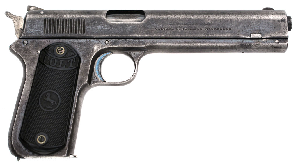 Colt Model 1900 Right Side - "AUTOMATIC COLT" over "CALIBRE 38 RIMLESS SMOKELESS". Slide features rear plunge milled serrations.