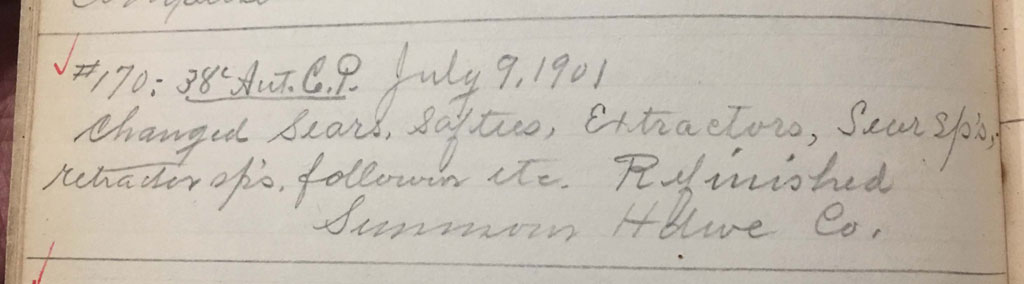 Colt Model 1900 Sight Safety Serial Number 170 - This is the factory repair record for Colt Model 1900 sn 170. "#170 - .38c Auto C.P. July 9, 1901, changed sears, safties, extractors, Sear sp's (springs), retractor sp's (springs). followers. etc. Refinished. Simmons Hdwe Co."