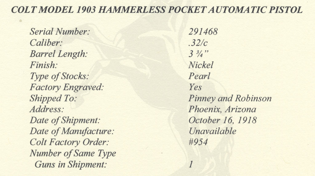 Colt Model 1903 Pocket Hammerless .32 ACP serial number 291468 - factory letter indicating that pistol was engraved, nickel plated with recessed medallion mother of pearl stocks. Pistol was a one gun shipment to Pinney and Robinson, Phoenix, Arizona on October 16, 1918. Shipment was processed on Colt Factory Order Number 954.