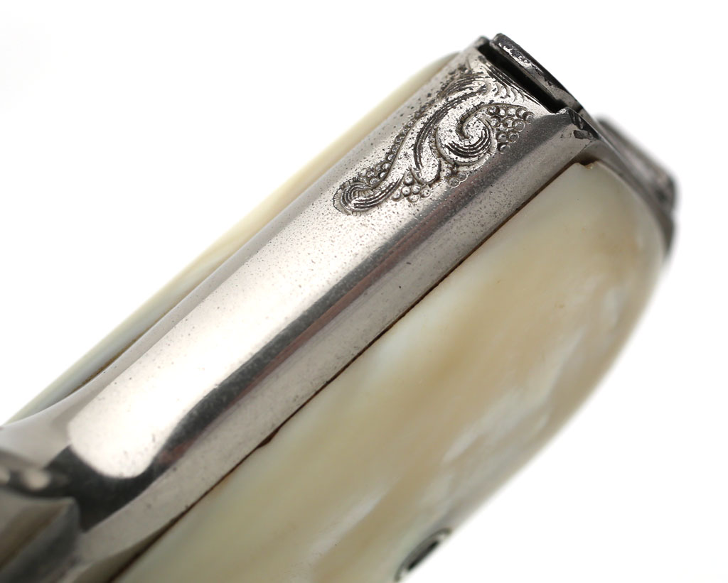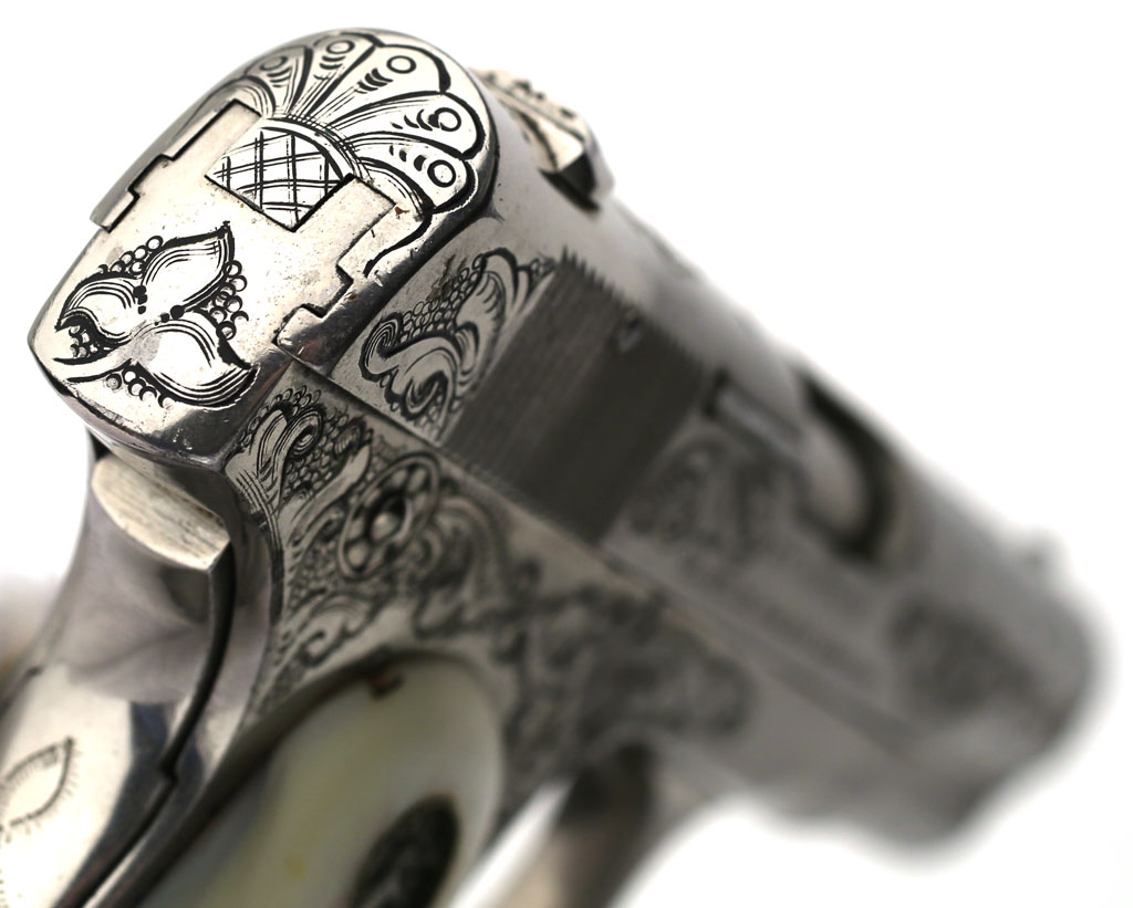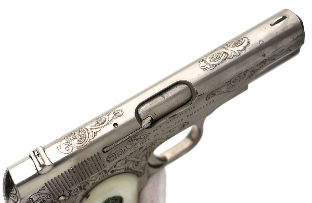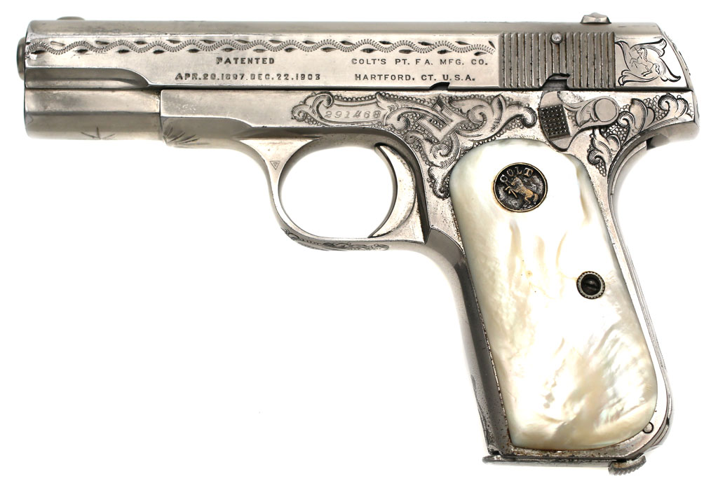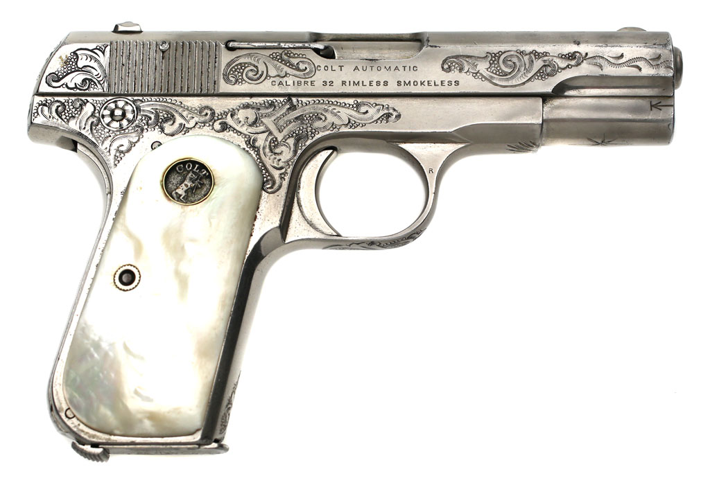Colt Model 1903 Pocket Hammerless .32 ACP serial number 291468 - factory engraved, nickel plated with recessed medallion mother of pearl stocks. Pistol was a one gun shipment to Pinney and Robinson, Phoenix, Arizona on October 16, 1918. Shipment was processed on Colt Factory Order Number 954. Engraving design is seen on Cuno Helfricht factory engraved pistols.