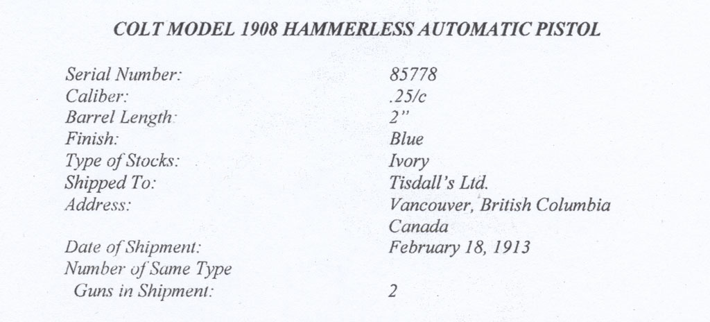 Colt 1908 Vest Pocket .25 ACP serial number 85778 - Pistol is high polished blue and is fitted with original factory recessed medallion round-top ivory stocks. This pistol was shipped from the factory with blue finish and factory ivory stocks on February 18, 1913 to Tisdall's Ltd. in Vancouver, British Columbia, Canada in a two gun shipment.
