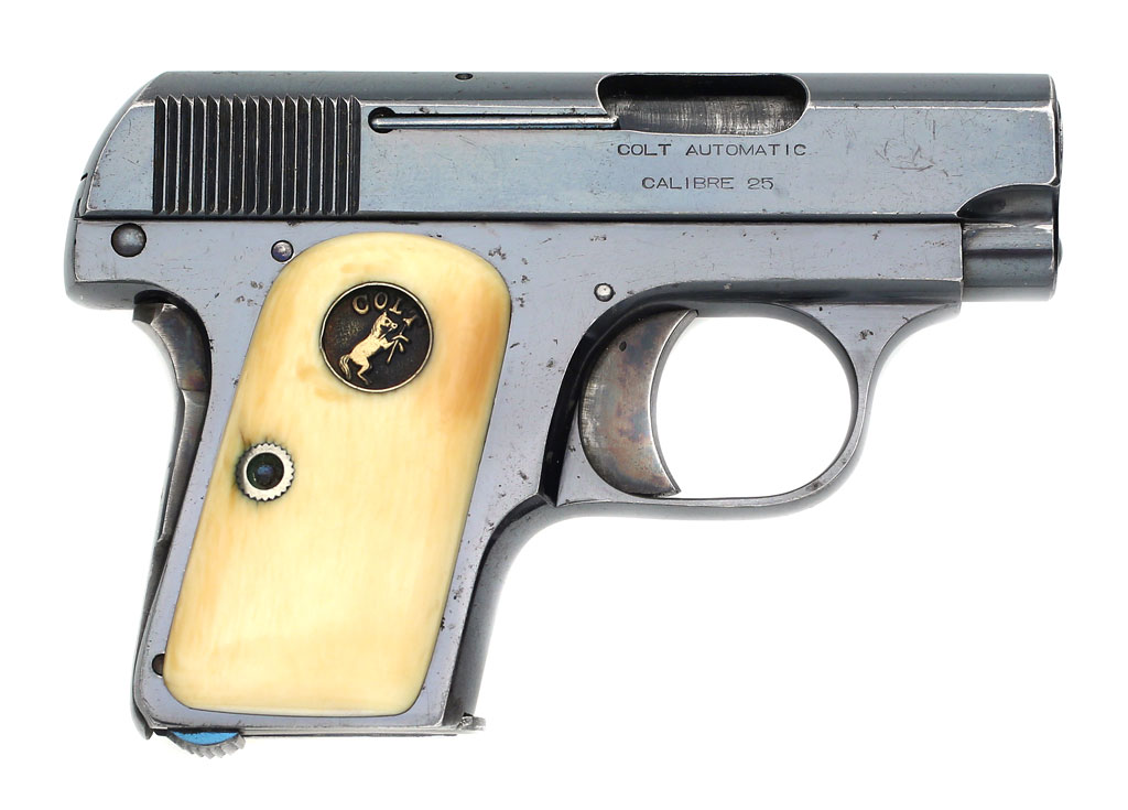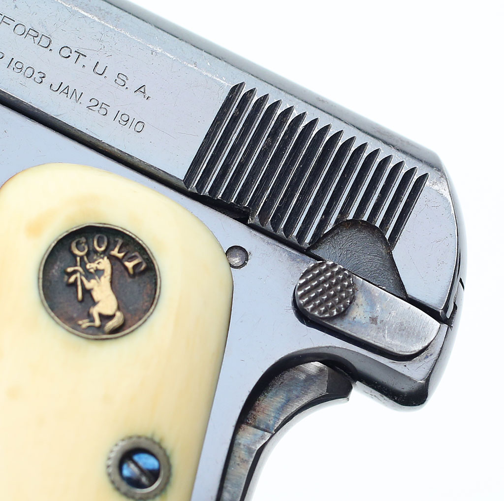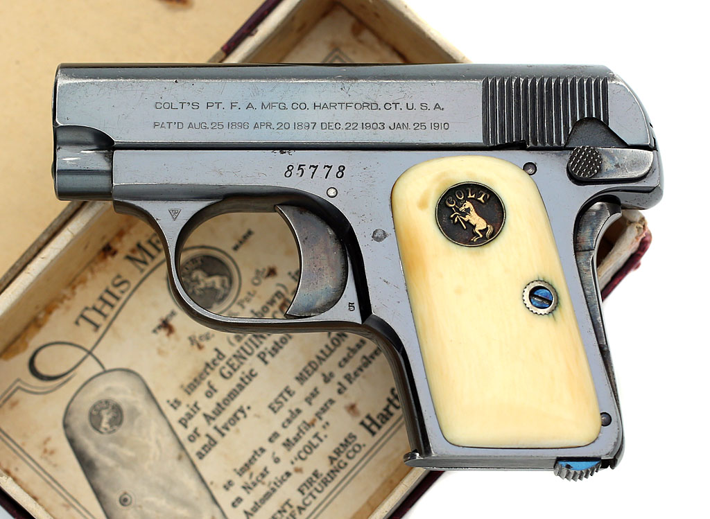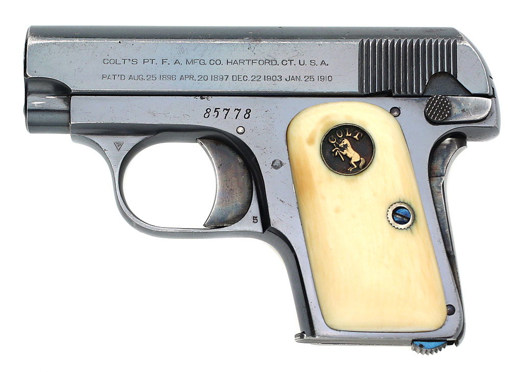 Colt 1908 Vest Pocket .25 ACP serial number 85778 - Pistol is high polished blue and is fitted with original factory recessed medallion round-top ivory stocks. This pistol was shipped from the factory with blue finish and factory ivory stocks on February 18, 1913.