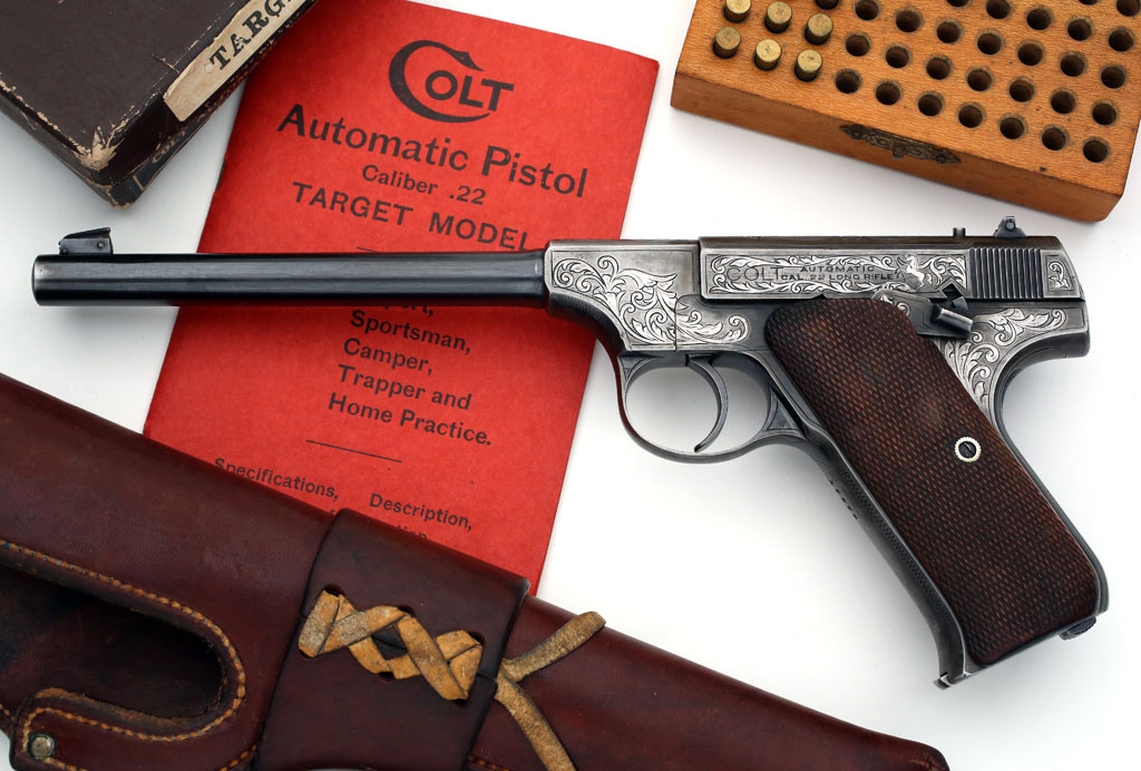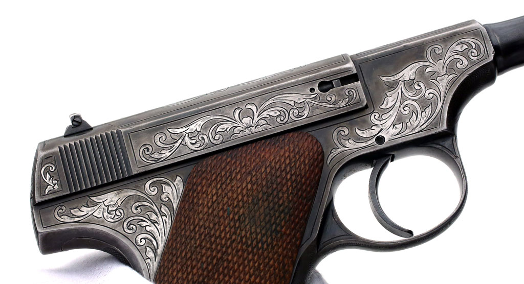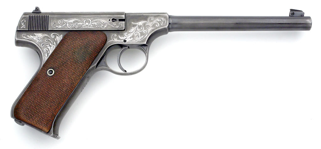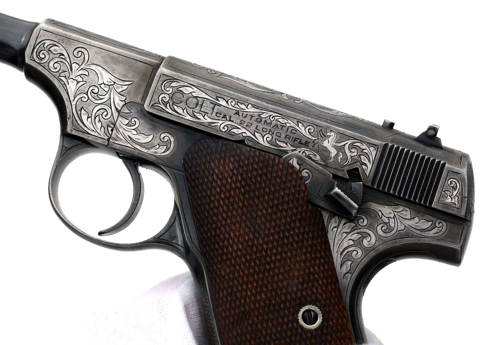 Colt Automatic Target Pistol .22 LR Serial Number 17570 - top of slide and frame showing intricate factory engraving and silver inlay.