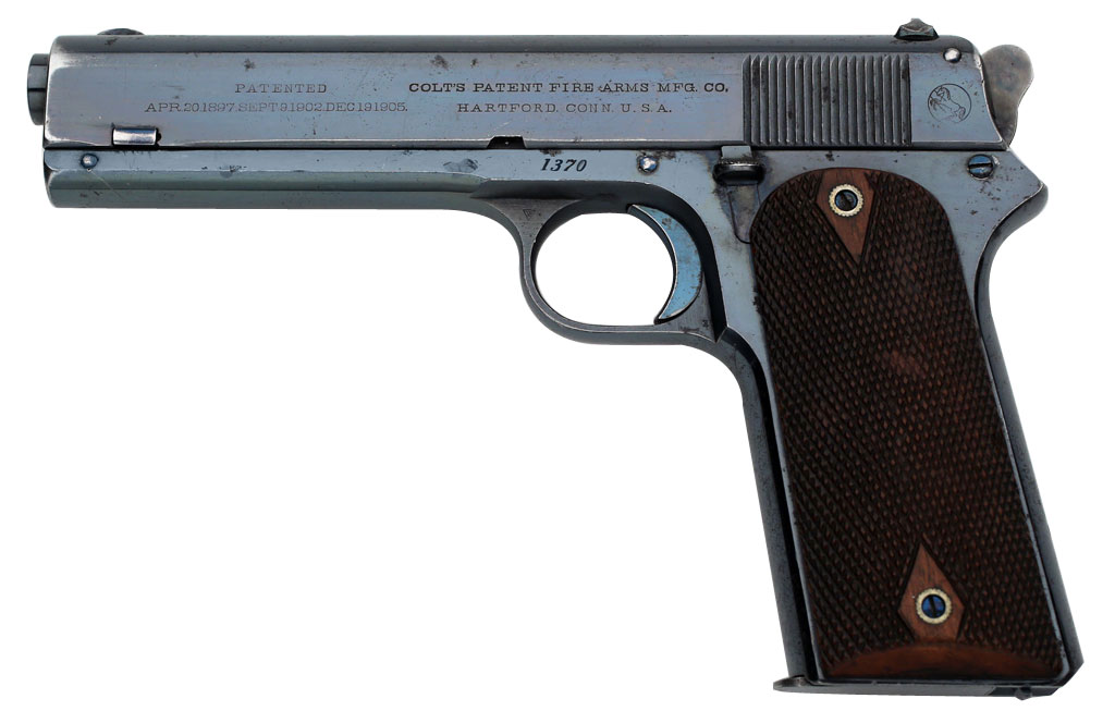 ![]() Model 1905 Military .45 Serial Number 1370 - .45 caliber, blue finish, checkered walnut stocks, high polish finish with early style round hammer. (ca. 1906)