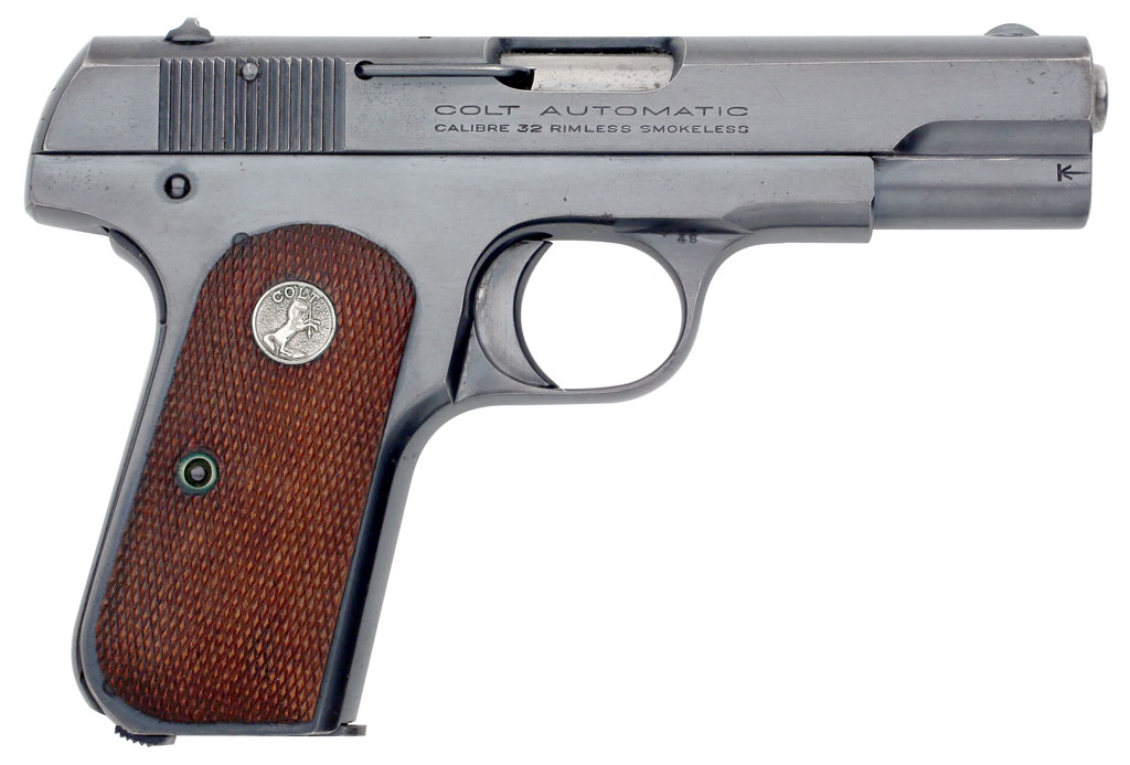 Colt Pocket Hammerless 1903 .32 ACP serial number 455504 (ca. 1924) - Right side This early forward facing flush medallion variation transitioned quickly to Colt's moving to a single style medallion, where the left medallion faces the muzzle and the right medallion faces the rear of the pistol. This was a time saving measure in production since the stock makers only had to worry about fitting one style of medallion. The detail of the flush medallion also evolved over time showing less stippling adjacent to the Rampant Colt on the medallion. The profile of these stocks was also changes which eliminated the point at the toe. |